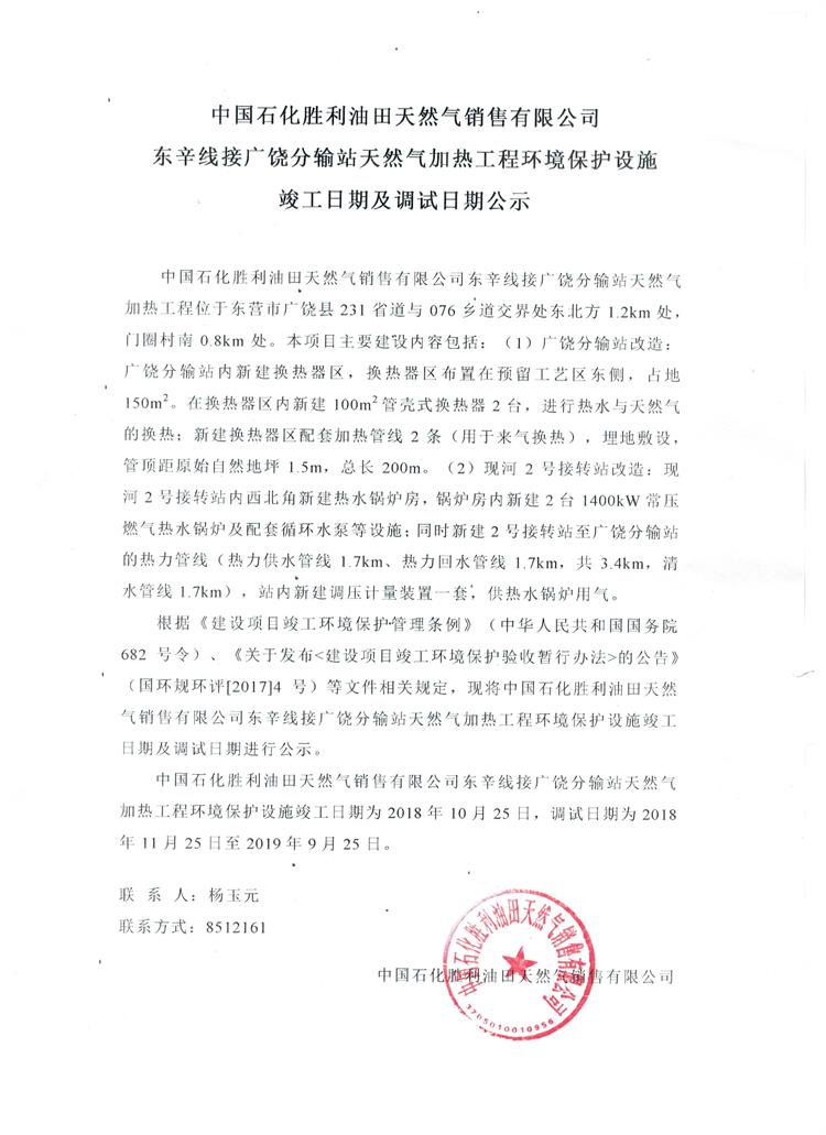 中國石化勝利油田天然氣銷售有限公司東辛線接廣饒分輸站天然氣加熱工程環(huán)境保護(hù)設(shè)施竣工日期及調(diào)試日期公示