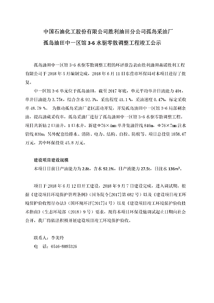 中國石油化工股份有限公司勝利油田分公司孤島采油廠孤島油田中一區館3-6水驅零散調整工程竣工公示